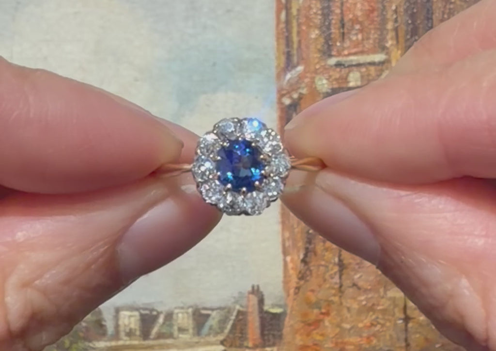 Edwardian sapphire an old cut diamond cluster ring