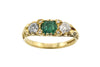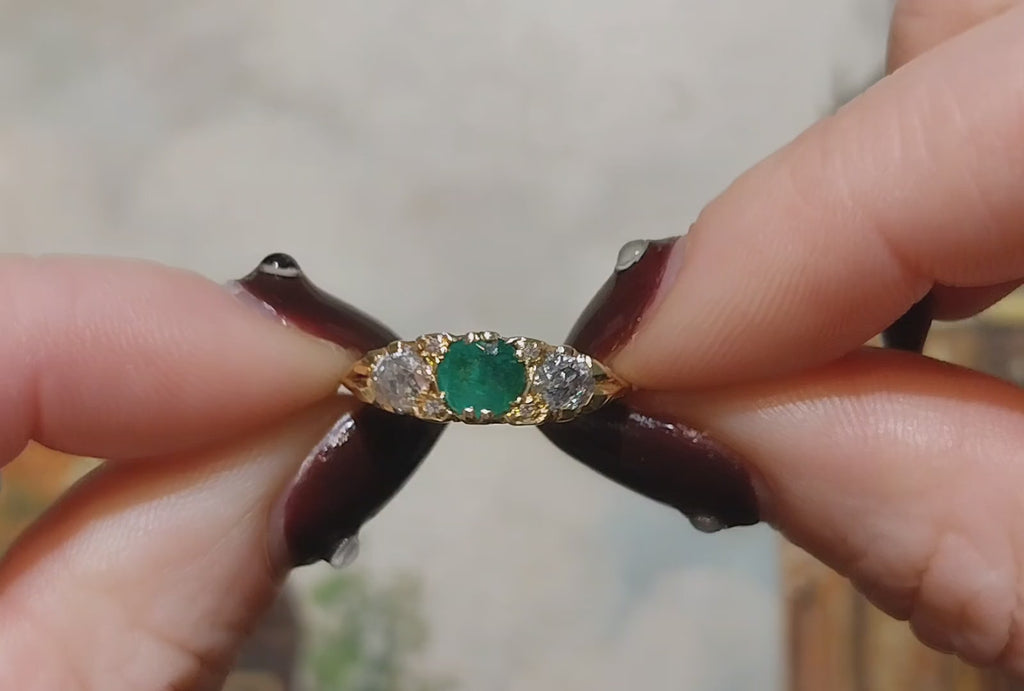A vintage 18 carat gold ring with round faceted emerald, two old mine cut diamonds and four small single cut diamonds. The ring is hallmarked for the City of Birmingham and the year 1995.