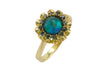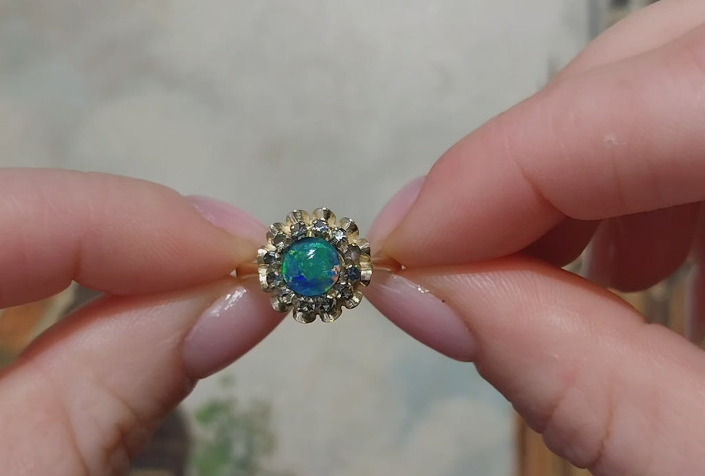 Een vintage ring van 14 karaat goud met een cabochon opaal doublet in een halo van 12 saffieren.