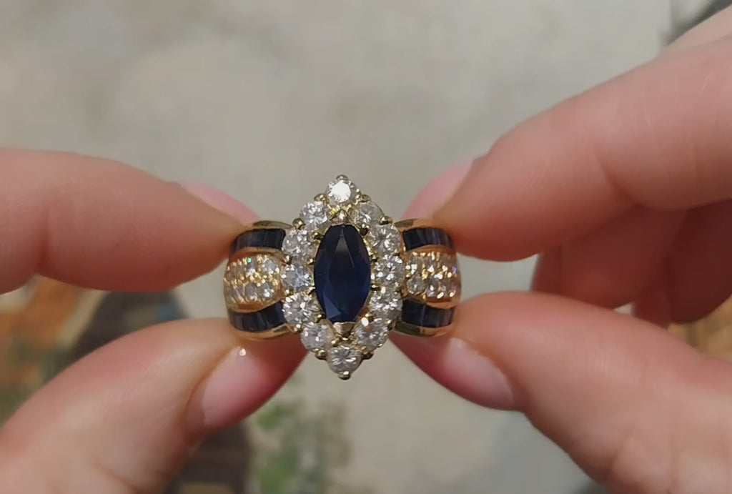 Marquise sapphire and diamond ring in 18 carat gold-Vintage Rings-The Antique Ring Shop