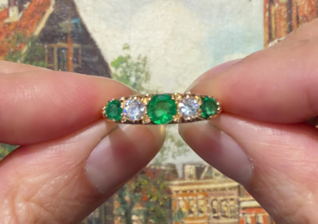 A vintage 18 carat gold ring with three round faceted emeralds and two brilliant cut diamonds. The center emerald has a diameter of 4 mm and the emeralds are around .50 carat in total. The diamonds are .30 carat in total, VS in quality and G in color.