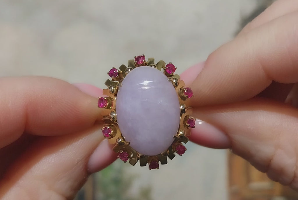 Cabochon lavender jade and ruby ring