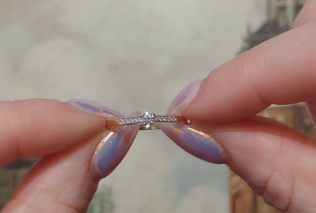 10 of the diamonds are set into the shoulders of the ring, the larger diamond is prong set in the middle. The diamonds are .21 carat in total, VS in quality and H in color.