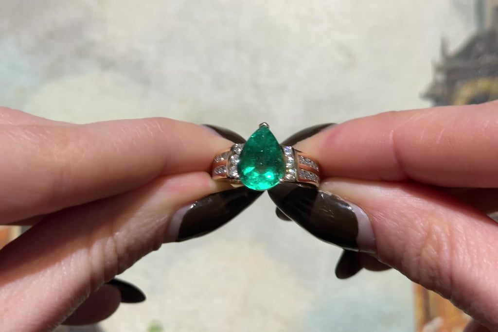 An 18 carat gold ring with a pear shaped colombian emerald and 22 brilliant cut diamonds.