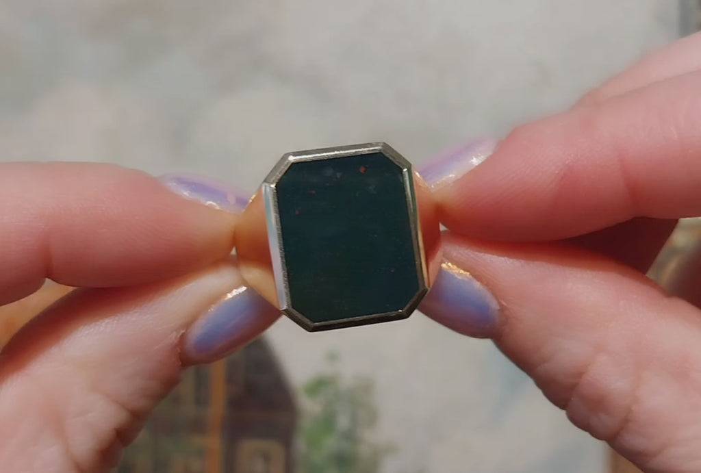 The bloodstone, which is also known as heliotrope, is dark geen in color with red spots throughout. The stone measures 15 mm by 12 mm, the ring weighs 9.6 grams.
